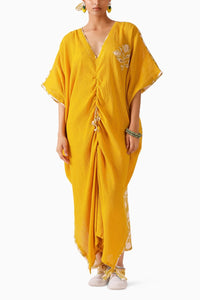 Featuring the Olive Pomegranate Ruching Kaftan by Nikasha from its Pomegranate Collection. Crafted from cotton crush and voile, this olive kaftan showcases pomegranate prints with hand-embroidered appliqué and delicate flower tassel detailing—combining artisanal charm with a relaxed, elegant silhouette.