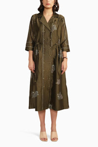This Olive Printed Side Gathered Shirt Dress in Silk Chanderi combines effortless style with a flattering, contemporary design. The side gathering adds a unique silhouette, while the delicate print and luxurious fabric ensure both comfort and elegance. Perfect for both casual and semi-formal occasions, this dress offers a sophisticated, chic look.