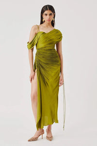Featuring the Olive Ruched Dress from Aroka's Signature Collection, a sculpted ruched bodycon dress crafted in lustrous modal satin. Artfully detailed through the bodice with an adjustable side slit for effortless movement, it features a draped shoulder panel with a detachable sleeve for versatile styling. This full-length olive green dress beautifully captures warmth, elegance, and ease.