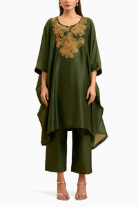 This Olive Green elegant kaftan features intricate embroidery on the front yoke, adding a touch of artistry to the design. The stylish round neck with a slit and 3/4th sleeves finished with cuffs provide a sophisticated and refined silhouette. Paired with ankle-length pants featuring subtle side-seam piping, this ensemble effortlessly combines comfort with style, making it perfect for both casual and semi-formal occasions.