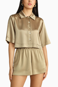 Featuring the Olive Silk Cropped Bowling Shirt by Refined Revolution. This elegant piece is crafted from 100% silk charmeuse satin, featuring mother of pearl buttons and an A-line fit with back yoke gathers. Designed for a relaxed fit, true to size.