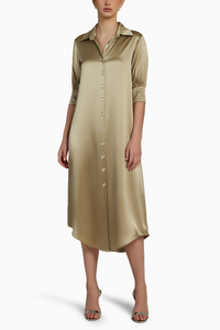 Featuring the Olive Silk Shirt Dress by Refined Revolution. Elevate your wardrobe with this exquisite shirt dress crafted from 100% silk charmeuse satin. Embellished with elegant mother of pearl buttons, it offers versatility with the option to wear with or without a separate sash belt. Designed for a true-to-size, relaxed fit, exuding effortless sophistication.