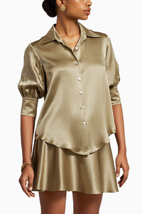 Featuring the Olive Silk Short-Sleeved Shirt by Refined Revolution. Luxuriate in espresso-hued charm, crafted from 100% silk charmeuse satin. With oversized collar and cuffs, shell effect buttons, and pleats at the elbow-length sleeves. Designed for a relaxed, true-to-size fit.
