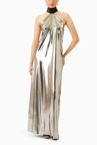 Featuring  Oly Steel Silver Dress by Kangana Trehan. This liquid foil maxi dress, complete with a black neckband and halter neckline is the definition of glamour. The perfect transitional piece, the dress shines through equally during the day, and night.