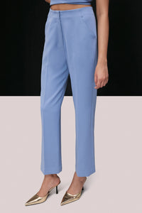 Ankle-length, tailored trousers with a high waist, a zip fly and button. Diagonal side pockets, false welt pockets at the back and tapered legs with sewn-in creases down the front, pressed creases at the back.