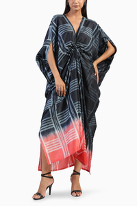 Introducing the Black and Red Ombre Shibori Silk Kaftan, a stunning addition to your festive wardrobe. This gorgeous kaftan features a striking v-neck design and a central front detail that enhances its sophisticated silhouette. The rich ombre effect of black and red adds a touch of elegance and drama, making it perfect for any special occasion. Crafted from luxurious silk, this kaftan combines comfort with high fashion, ensuring you look and feel extraordinary at your next event.