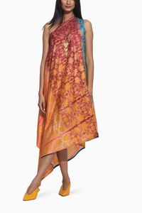 Featuring a contemporary style, this Ombre Brown Teal Shibori Cape has earthy color scheme. This is one shoulder drape cape which has sequence hand work all over.