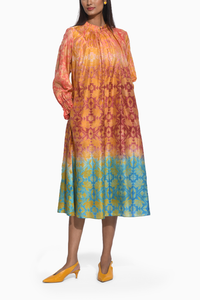 Presenting the color strokes for the festive season. Bold and beautiful, this Ombre Brown Teal Shibori Kurta has a two-in-one style. This tunic has ruffle detailing on the neckline, finished with handmade bori button closure and elasticated sleeves with ruffle finish.
