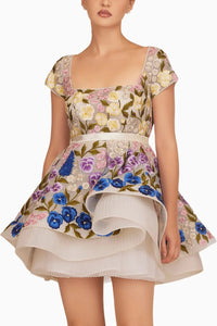 This mini dress is beautifully embroided with florals in an ombre pattern and stunning French knots, making this ensemble the perfect embodiment of grace and elegance.