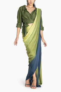 Composition- Satin Chiffon and Silk Colour- Green to Ink Ombre with Olive Fit- This sari fits true to size, takes the shape of your body as it is a drape. The sari is high waisted, get it according to your high waist size. The shirt is cut for a slim fit. Components- 2 Product code - SVE431882211605&2180108V