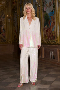 Sequin-embroidered pant in tonal ivory with a gentle pearlescent ombré that shifts into an iridescent sheen towards the hem. Relaxed fit with a straight, clean fall. Concealed side zipper with hook/eye closure.