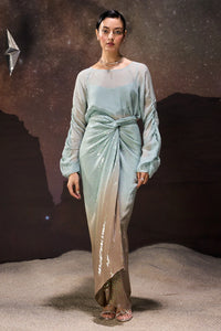 A dreamy ombre with a sheer organza top and a sequinned drape skirt. A seamless blend of contemporary style and timeless glamour.