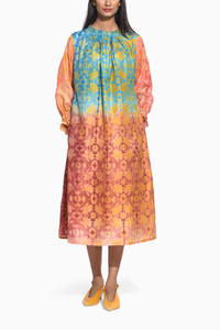 A bold and beautiful color scheme can be a game changer during the festive and wedding season! Crafted in rich silk fabric, this Ombre Teal Brown Shibori Kurta features a unique fit. This tunic has ruffle detailing on the neckline, finished with handmade bori button closure and elasticated sleeves with ruffle finish.