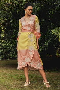 The Ombre Wrap Midi Dress is flattering and elegant crafted from premium ombre tenicil fabric with delicate honeycomb embroidery. This dress from The Golden Haze Collection offers effortless style and grace for any special occasion or summer event.