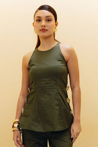 Tailored with clean lines and elevated by delicate golden floral brooch accents, this olive-green top blends structure with charm. The rich earthy tone grounds the look, while the metallic detailing adds a subtle glow that catches the light beautifully. Designed to feel polished yet expressive, it’s a piece that turns everyday dressing into something thoughtfully styled — perfect for when you want confidence with a hint of fun.