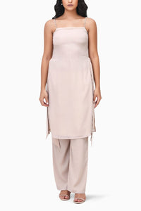 The On the Record Set combines understated elegance with a touch of sparkle. The straight kurta features delicate pearl and rhinestone-embellished straps that elevate the design. Dual side straps provide a playful detailing element, enhancing the overall silhouette. The back waistband of the pants is elasticated for ease of wear, ensuring both comfort and style. This set is perfect for festive evenings where subtle glamour meets modern simplicity.