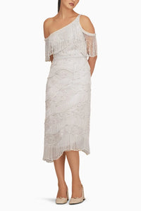 This stunning one-shoulder midi dress features handcrafted beaded fringes that add texture and movement, complemented by a chic, structured belt for a flattering silhouette. Its elegant design is perfect for making a bold yet sophisticated statement.