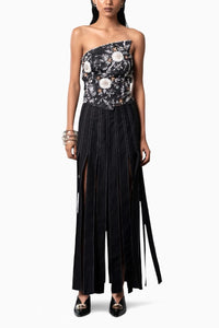 The Sumi Embroidered Corset, featuring structured hand embroidery and boning for support, is paired with a unique ankle-length skirt. The skirt boasts multiple slits from mid-thigh down, creating a shredded effect, with contrasting top stitching on each panel, making for an edgy and stylish combination.