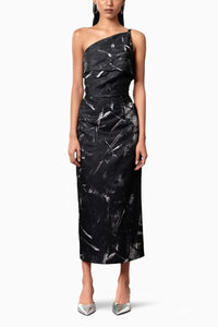 The Onyx Foldover Dress is a sleek, fitted midi-length design with a stylish one-shoulder neckline. The pleated foldover detail at the bodice adds texture and sophistication, while the back slit offers both comfort and ease of movement, making this dress the perfect combination of elegance and practicality.