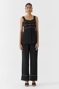 The Onyx Linen Blazer & Trousers Co-ord crafted from our stunning viscose linen fabrication, trans-seasonal, is a statement piece. This blazer, in our onyx black, is hand embroidered with studs and has a front opening. It is lined and sleeveless. The cut of the bust is fitted and it has side slits. It is paired with our hand embroidered straight linen trousers. Wear it with heels for an elegant look.