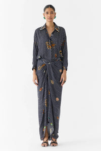 The Onyx Polka Dot Kimono crafted from our stunning vegan silk fabrication, trans-seasonal, is a statement piece. This set, printed in our jewels polka dot print, has a relaxed fit. With dropped sleeves and a joined shirt and skirt, the piece has front shell buttons. It has small lace detailing on the collar. Featuring a draped skirt, this piece can be tied with a knot and can be styled in different ways. Wear it with heels for an elegant look.