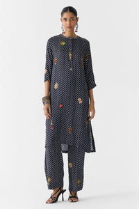 The Onyx Polka Dot Straight Kurta & Pants crafted from our stunning vegan silk fabrication, trans-seasonal, is a statement piece. This set, printed in our jewels polka dot print, is a two piece set. The kurta is a straight fit with high side slits. It has a front opening with Swarovski details and hand embroidered with beads. It is paired with our  matching onyx straight pants with an elasticated back. Wear it with heels for an elegant look.