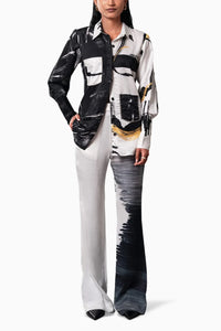 The Onyx Shirt and Ni Trouser make a stunning pairing for a sophisticated yet bold look. The Onyx Shirt features dramatic long sleeves with striking cuffs and pearl-embroidered patch pockets on both sides, adding an elegant touch to the design. Paired with the Ni Trouser, a well-fitted, flared style with a unique placement print on one side, this ensemble effortlessly blends classic tailoring with contemporary flair, making it perfect for any stylish occasion.