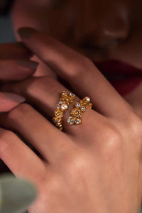The Essence- A stylish blend of classic and contemporary design vocabulary--this wrap-around ring is crafted with Morning Star and Pastel Plum stones. Its design is both sleek and innovative, featuring a band that wraps around the finger with fluid grace, creating a visually captivating and unique silhouette.