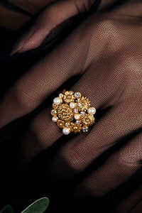 The Essence- This versatile ring features a floral disk spattered with radiant Morning Star and Pastel Plum stones. Pair this with the Opaline bangle and Perla choker to complete your look.