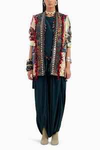 This yoke embroidered classic open jacket blends timeless style with tribal-inspired details. Featuring intricate resham thread embroidery, cowri shells, and bead and thread tassel accents, it offers a sleek, structured silhouette. A versatile and sophisticated addition to any wardrobe, it combines traditional craftsmanship with contemporary elegance.