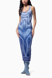 Inspired by the human skeleton, this dress features a striking optical illusion with a trompe l’oeil print. Crafted from stretchable jersey fabric, it offers a bodycon fit that hugs your shape for a sleek and flattering silhouette. The sleeveless design and optic blue color add a modern and bold touch to the look.