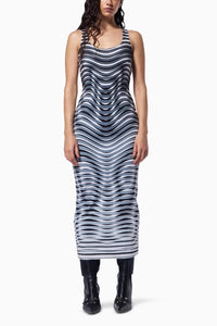 This bodycon dress features a striking trompe l’oeil print inspired by the human skeleton, creating a captivating optical illusion. Made from stretchable jersey fabric, it offers a comfortable fit and sleek silhouette. The sleeveless design and optic grey color add a modern, versatile touch, making it perfect for making a bold statement.