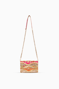 Featuring the Orange and Pink Janus Clutch by 5 Elements by Radhika Gupta. Discover the vibrant allure of this multi-color clutch, a kaleidoscope of hues in one stylish accessory. Chic and compact, it seamlessly blends contrasting colors, adding a playful touch to your ensemble. Elevate your fashion statement with this versatile and eye-catching accessory, complete with a detachable crossbody chain for added convenience.