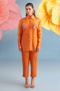 Vibrant and bold in vivid Orange, the Chloe Co-ord Set is a striking 3-piece ensemble featuring a breezy shirt, sleek inner, and tailored pants. Crafted from pure silk organza and imported crepe, it’s brought to life with playful neon 3D floral appliqué work — a fresh, modern twist on classic femininity. This set beautifully captures the romance of the English era and Parisian elegance — perfect for evening wear and formal occasions.