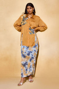 Playful yet polished, the Echo Cora Co-ord Set is where art meets relaxed elegance. The set features a fluid breathable satin shirt in a warm ochre hue, adorned with abstract hand-dyed motifs that lend a whimsical edge. Paired with a straight-cut tie-dye skirt , the look captures a perfect balance of structure and spontaneity. Ideal for brunches, gallery strolls, or creative workspaces—this set is made for those who dress with quiet confidence and a touch of fun.