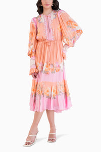 Featuring the Orange Corsage Printed Calf Length Chiffon Dress by Mandira Wirk's Waves of Love Collection. This vibrant dress showcases a beautiful placement print, puff sleeves, a tied gathered waist, and a neck tie, blending comfort and style in stunning orange and pink hues. Perfect for any occasion!