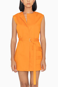 Featuring Cova Santa Dress by Contemponari. A mini dress with stylized collar, accompanied by a waist belt for a tailored fit. The ensemble is elevated with exaggerated flap pockets.