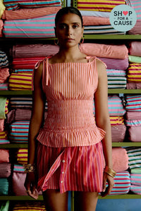 Daman top is designed using striped cotton fabric. It features a boat neck, a smocked drop waist, and self-tie shoulder straps for a comfort fit.