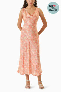 Featuring the Orange Hampi Dress, crafted from 100% hand block printed satin. This midi dress showcases a stylish cowl neck design, offering a straight fit that's perfect for a relaxed summer day, combining elegance with comfort effortlessly.