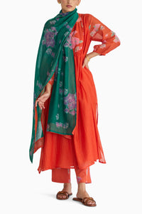 Introducing the Handwoven Chanderi Kurta in a vibrant orange hue, featuring exquisite Bougainvillea floral block prints meticulously applied by hand. This elegant kurta is complemented by a matching green handwoven chanderi dupatta, enhancing its traditional charm. Paired with cotton trousers, this ensemble offers a perfect blend of striking color and intricate detailing, ideal for making a memorable impression at any event.