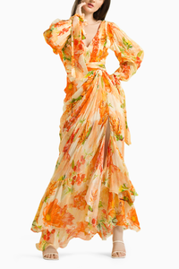 The Orange Lilium chiffon dress is a radiant and breezy choice that embodies the spirit of sunshine and warmth. The vibrant orange hue radiates energy and positivity, making it an excellent pick for lively occasions. This dress features chic waist buckle details that create a flattering cinched effect, highlighting the waist beautifully. The chiffon fabric adds an airy and graceful touch, making it perfect for summery events. This dress is a captivating blend of style and comfort, ideal for those who want to shine with a touch of elegance and a pop of color.