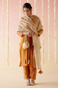 This chic three-piece set includes a Kurta, Pant, and Dupatta. The Kurta, made from Chanderi fabric, is beautifully adorned with Dori embroidery on the neck and sleeves, complemented by elegant gota lace detailing for a traditional touch. Paired with straight leg pants and a matching Dupatta, this set offers a coordinated look that blends cultural charm with modern style. Crafted from fine, luxurious fabric, it ensures all-day comfort and sophistication.