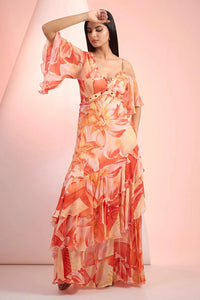 Featuring Orange Love Printed Dress by Mandira Wirk's Love Note Collection. This printed dress features an asymmetrical shoulder design, tiered silhouette, and rivet detailing on the yoke, combining bold style with delicate detailing for a standout look.