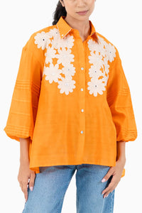 Featuring Orange Monarch Shirt by URAIB from The Forest Affair Collection. Meticulously crafted from Chanderi fabric, this hand-made patched orange shirt exudes timeless elegance, making it a versatile and stylish addition to your wardrobe.