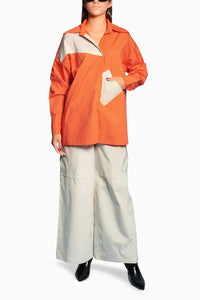 Featuring Orange Mud Shirt Pants Set by Alan by Vani from Sky is High Collection. This coordinated set showcasing an orange mud shirt with a blocking technique applied for a distinctive design element. It's paired up with mud color pants.