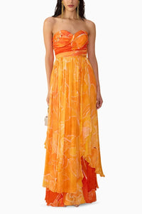 Featuring the Orange Ombre Amora Dress by Saaksha & Kinni's Akara Collection A/W'25. Dual floral print strapless asymmetric dress with sweetheart neckline and surplice bodice- feminine elegance meets bold construction in this statement silhouette.
