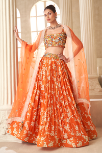 Orange Printed Embroidered Lehenga Set