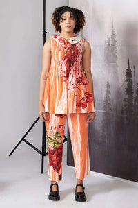 Embrace our Orange Scratch Print Peplum Co-ord Set, a symbol of contemporary sophistication. The vibrant scratch print design exudes confidence and modernity. With its smock-topped, Peter Pan collar and mid-waisted pant, this ensemble offers versatility and charm, while it's sleeveless ensemble suitable for any occasion, casual or formal. Flaunt your fashion-forward sensibilities effortlessly in this chic ensemble.fragment.