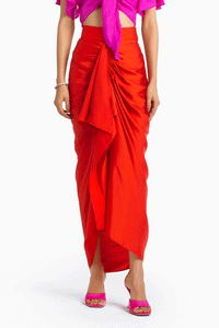 Our signature draped skirt that's cut in a pencil fit. The front drape gives a flattering look to the body and can be worn with a shirt or your favorite top. The satin sheen makes it a great option for a night out. Closes on the side with a concealed zip. Wear with your favorite diamonds and heels for a head-turning ensemble.