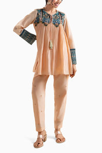 The Pink Orani applique embellished top features beautiful detailing with front gathers, adding a feminine and textured touch to the design. Paired with elegant chanderi pants, this ensemble strikes a perfect balance between contemporary style and traditional charm. The combination is ideal for festive or semi-formal occasions, offering both comfort and sophistication.